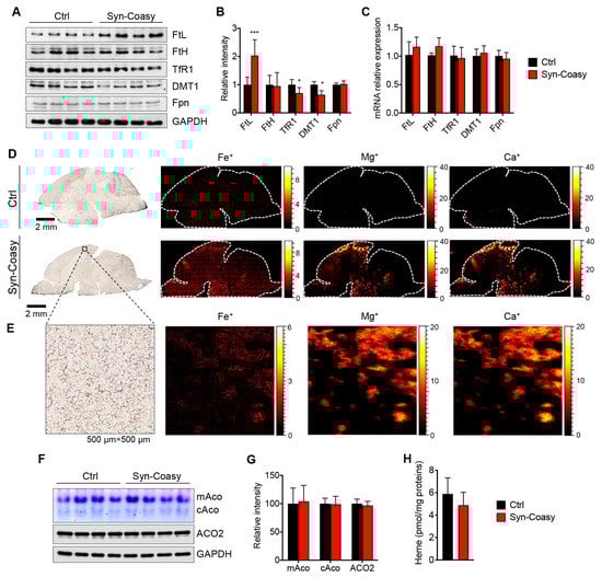 29]. Associated to iron accumulation, here we found a profound and consistent alteration of iron homeostasis-regulating proteins, such as FtL, TfR1, and DMT1. Particularly evident is the accumulation of the ferritin L-chain in different brain areas, which seems to mainly accumulate into GABAergic interneurons of internal cortical layers. Our hypothesis is that the very short lifespan of the animals prevented iron from accumulating to high levels. Nevertheless, FtL accumulation and TfR1 and DMT1 reduction would represent the primordial molecular events of a subsequent more prominent iron dyshomeostasis. This hypothesis is corroborated by the evidence that a normal amount of heme and aconitase activity is present in Syn-Coasy mice euthanized at 13 days of life.