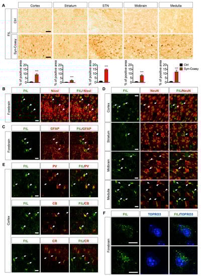 Table S2) diluted in blocking solution. For immunohistochemistry (IHC), goat anti-rabbit or anti-mouse biotinylated secondary antibodies (1:1000, Jackson Immunoresearch, Ely, UK) were applied for 1 h at room temperature. Signal detection was performed by using Vectastain Elite ABC kit (Vector, Burlingame, CA, USA) and DAB solution (Vector, Burlingame, CA, USA), according to the manufacturer’s instructions. Sections were mounted on gelatin-coated glass slides with cromalin solution, dehydrated in graded ethanol, cleared in Bioclear (Bio-Optica, Milan, Italy), and covered with DPX (Sigma-Aldrich, Milan, Italy). Labeled structures were examined under bright-field illumination on a Zeiss Axioplan2 microscope (Zeiss, Milan, Italy). Digital images were acquired with a Zeiss camera using AxioVision software (Zeiss, Milan, Italy). Percentage of positive area was calculated using ImageJ software (NIH, Bethesda, MD, USA). For immunofluorescence (IF), sections were stained with Alexa Fluor 488-conjugated goat anti-rabbit IgG (Thermo Fisher, Monza, Italy), Alexa Fluor 568-conjugated goat anti-mouse IgG (Thermo Fisher, Monza, Italy), Neurotrace fluorescent Nissl stain (ThermoFisher, Monza, Italy), and TO-PRO-3 nucleic acid stain (ThermoFisher, Monza, Italy). Sections were mounted on gelatin-coated glass slides using Fluorsave (Calbiochem, San Diego, CA, USA) and acquired on a TCS-SP8 laser confocal microscope using LAS AF software (Leica Biosystems, Buccinasco, Italy).