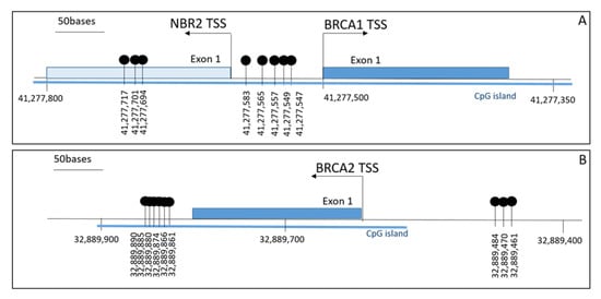Individual CpG sites investigated in BRCA1 (A) and BRCA2 (B) promoter. Genomic coordinates correspond to the RefSeq NM_007294, transcript variant 1 (BRCA1 gene) and NM_000059.3 (BRCA2 gene), using GChr37/hg19 assembly. TSS: Transcription Start Site.