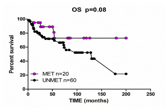 We compared clinico-pathological features of BRCA1/2 methylated versus unmethylated EOCs (Table 1), and no statistical significances have been observed between the two different patient populations. Of note, a positive family history for breast or ovarian cancers was observed in 11 out of 68 (16.2%) unmethylated EOCs, and in only 1 out of 20 (5.0%) methylated EOCs. Although no statistical differences between the two groups were observed, it is worth noting that platinum-sensitivity at 6 and 12 months of treatment was recorded, respectively, in 90% and 80% of methylated EOCs, compared to 80% and 72.6% of unmethylated EOCs; time to disease progression was 60 and 52 months for methylated and unmethylated EOCs, respectively. On the contrary, overall survival analyses underlined a consistent better overall survival for the BRCA methylated subset, with a proportion of overall survival at 200 months of 72% compared to 22% in unmethylated EOCs (p = 0.08; Figure 2).