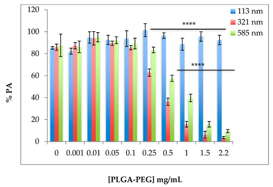 Following the addition of the agonist, ADP, to platelets incubated with 113 nm PLGA-PEG NPs, no significant effect on % PA was observed. This was in agreement with published data as a recent study suggested that exposure of PRP to colloidal gold NPs of 30 and 50 nm hydrodynamic sizes did not show any effect on untreated or collagen-treated platelets in PRP [18]. Another published study investigating gold NPs of small sizes (13, 20, and 29 nm) indicated no effect on platelet aggregation in PRP induced by 15 µM ADP [19]. Interestingly, nano-silver particles of 13–15, 30–35, and 40–45 nm were reported to exhibit an inhibitory effect on platelet aggregation in PRP induced by ADP at 15 µM, all to a similar extent [20].