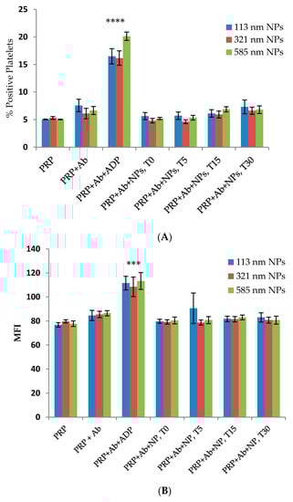 Flow cytometry analysis of the effect of size of PLGA-PEG NPs at 2.2 mg/mL on platelet activation over time (T) in minutes. (A) % Positive platelets (% PP); (B) Mean fluorescence intensity (MFI). NPs were incubated with aliquots of resting platelets in PRP for 4 min without stirring prior to the addition of anti-CD62P antibody (10 µg/mL). Then, the reaction was terminated using 1% v/v FA at the specified time (T) intervals. % Positive platelets represents the percentage CD62P-positive platelets in the total platelet population. *** p < 0.001 **** p < 0.0001 as compared with PRP+Ab (control) one-way ANOVA followed by post hoc Tukey test.