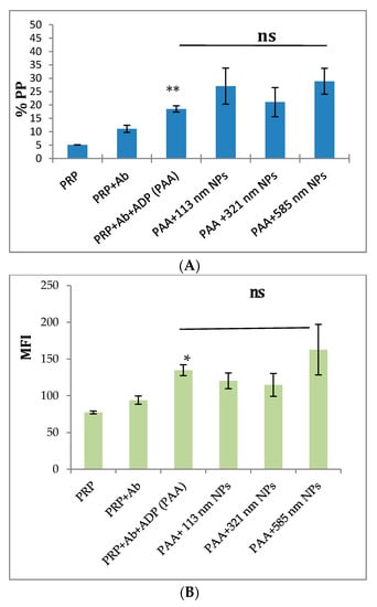 Flow cytometry analysis of the effect of size on PLGA-PEG NPs, at 2.2 mg/mL, on ADP activation of PRP. (A) % Positive platelets (% PP); (B) Mean fluorescence intensity (MFI). Data are the average of n = 3–5 ± SEM. The NPs were pre-incubated with aliquots of platelets in PRP, followed by activation using 20 µM ADP. Samples were, then, incubated in the presence of CD62P antibody (10 µg/mL). % Gated platelets represent the percentage of CD62P-positive platelets in the total platelet population. * p < 0.05, ** p < 0.01 as compared with PRP+Ab+ADP (control), one-way ANOVA followed by post hoc Tukey test, ns = not significant.