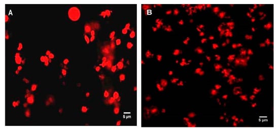 Representative confocal microscopy images. (A) Resting platelets in PRP; (B) ADP-induced platelets in PRP. Platelets in PRP were fluorescently labelled with phalloidin-TRITC at 0.25 mg/mL and fixed using 1% formaldehyde. Magnification 100×. Scale bar represents 5 µm.