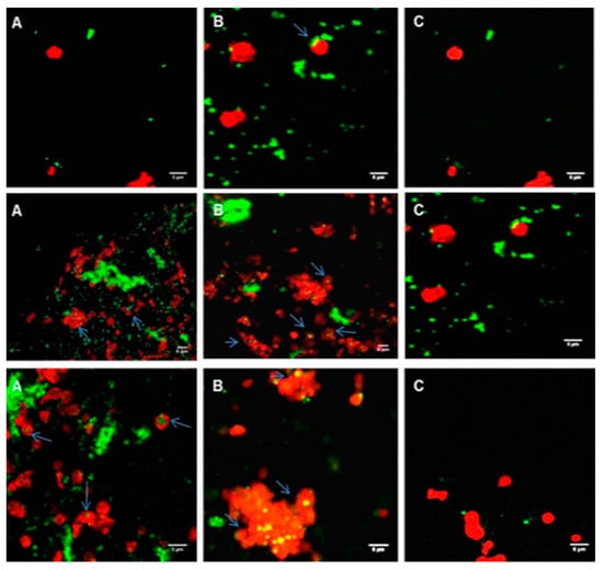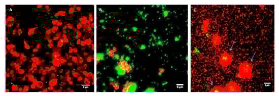 Confocal microscopy images showing ADP-stimulated platelets in PRP (red) incubated with coumarin-labelled PLGA-PEG NPs (green). (A) 113 nm; (B) 321 nm; (C) 585 nm, at 2.2 mg/mL NPs. Platelets in PRP were fluorescently labelled with phalloidin-TRITC at 0.25 mg/mL and fixed using 1% formaldehyde. Magnification ×100, scale bar represents 5 µm.