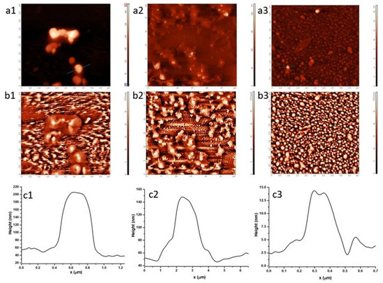 To study the size and morphology of Fh particles coated with HSA, an AFM analysis was performed. Using the semicontact mode AFM, we succeeded in 3D visualization and characterization of individual particles and particle groups of Fh-NPs deposited on a mica substrate. Figure 2 shows the topography (Figure 2a1,b1,c1) of the samples that allows roughness profile investigation. The contrast phase (Figure 2b1–b3) images help differentiating regions of high and low surface adhesion or hardness. The profiles (Figure 2c1–c3) associated with Fh samples ((1) simple, (2) doped with Co, and (3) doped with Cu) enable estimation of the average diameter of Fh-NPs coated with HSA.