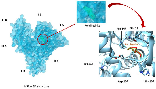 The ligand, Fh, is positioned in the HSA metal binding site (Figure 3), which is surrounded by Trp 214, Tyr 30, Tyr 84, Tyr 148, and also other residues (Ala 26, Ala 26, Ala 143, Arg 98, Arg 144, Asp 107, Asp 108, Asp 89, Asn 99, Asn 111, Cys 101, Cys 90, Glu 100, Glu 86, Gln 32, Gln 33, Gln 29, His 427, His 105, Met 87, Ile 25, Phe 27, Phe 102, Pro 110, Pro 147, Lys 106, Leu 31, and Leu 103). Distance between Trp214 and ferrihydrite is 1.26 nm.