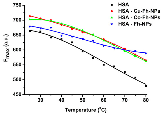 To study the stabilization of HSA structure in HSA-Fh-NPs hybrids, a very sensitive method of measuring HSA’s intrinsic fluorescence with temperature increase was applied [35]. The strong intrinsic fluorescence emission of HSA is due to the 214-Trp residue. The changes in the microenvironment of Trp-214 from HSA, caused by temperature, as well as increases (from 25 to 85 °C) in the presence of simple Fh-NPs and Fh-NPs doped with Co and Cu were monitored by fluorescence technique.