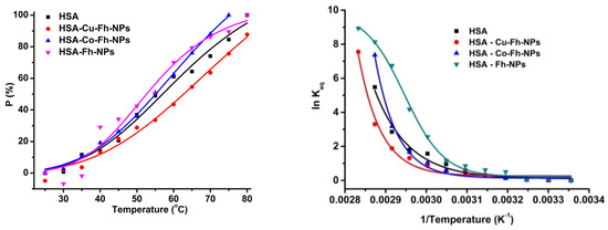 The graphical representation is presented in Figure 5 (right), where ln Keq is represented as a function of 1/T. The denaturation temperature can be estimated at around 55 °C for all HSA-NPs hybrid samples, but for the HSA-Co-Fh-NPs sample, a shift to 60 °C was observed.