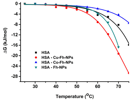 The variation of the Gibbs free energy, ΔG, for HSA (■), HSA-Fh-NPs (▼), HSA-Co-Fh-NPs (▲), and HSA-Cu-Fh-NPs (●), in 100 mM HEPES, at pH 7.25.