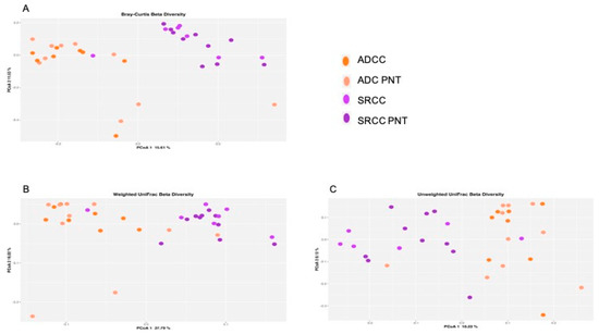 Principal coordinate analysis (PCoA) plot with Bray–Curtis dissimilarity. Results revealed significant differences between ADC (adenocarcinoma) and SRCC (signet-ring cell carcinoma) (A). Composition of the gut microbiota does not significantly change between ADC and SRCC samples; (B) unweighted and (C) weighted UniFrac measures of beta-diversity visualized using PCoA.