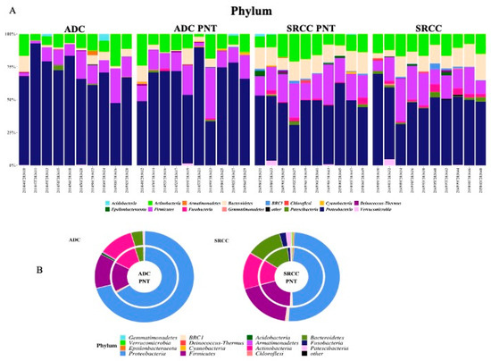 (A) The relative abundance at the phylum level for each sample. (B) Donut charts representing the relative abundance of phyla in ADC and SRCC groups. In particular, relative abundances represent the mean of the observed abundances per phylum in each group. Outer and inner donut chart represents tumor and healthy counterpart tissues, respectively.