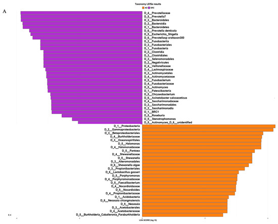 Based on the ASV distribution, the LEfSe (linear discriminant analysis coupled with effect size) tool allowed us to identify possible microbial biomarkers associated with a specific tumor subtype (Figure 3A).