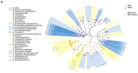 (A) LEfSe (linear discriminant analysis coupled with effect size) identified the most differentially abundant taxa between ADC, ADC PNT (paired non-tumor), SRCC and SRCC PNT. Only taxa meeting an LDA (linear discriminant analysis) significant threshold of >2 are shown. (B) Taxonomic cladogram obtained from LEfSe analysis of 16S sequences. In particular, two shapes are used to plot the nodes: circle and hexagon, corresponding to taxonomic and ASV clades, respectively. The node bodies are filled if associated to one specific condition following the LEfSe analysis. Moreover, the nodes background is imposed if all the child nodes belong to the same macro-group (i.e., ADC group and SRCC group correspond to tumor and healthy tissues collected from ADC and SRCC subjects, respectively). Unannotated clades correspond to ambiguous taxa in the reference taxonomy (i.e., SILVA).