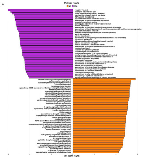 (A) LEfSe identified the most differentially abundant PICRUSt-predicted KEGG pathways between ADC and SRCC. SRCC-enriched pathways are indicated with a negative LDA score (purple) and pathways enriched in ADC with a positive score (orange). Only pathways meeting an LDA significant threshold of > 2 are shown. (B) Circos plot was generated to achieve insights into the relevant super-classes to which pathways belong.