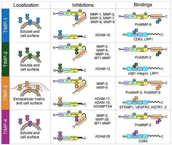 | TIMP-3 | Brain, heart, colon, kidneys, lungs, liver, breast, ovaries, prostate and testes, and eyes | Kidneys, liver, brain, heart, ovaries, cardiovascular system lungs, placenta, and breasts (underexpression) | [69,70,71,72,73] |