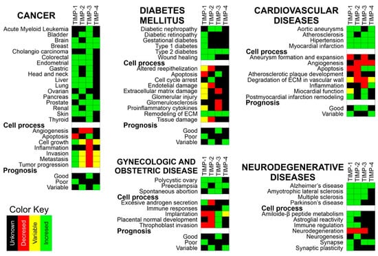 | TIMP-2 | Lymph nodes, brain, heart, arteries, colon, kidneys, liver, breast, ovaries, prostate, and testes | Kidneys, brain, heart, and ovaries, bone marrow and amniotic fluid (over- and underexpression) | [37,39,65,68] |