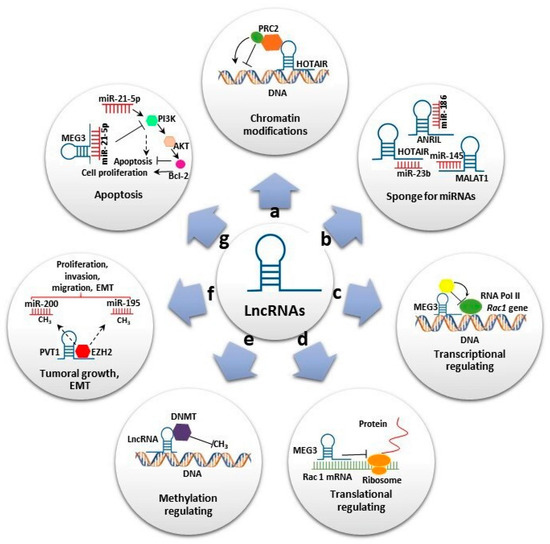 Long noncoding RNAs’ (lncRNAs) biological roles. (a) Some lncRNAs regulate gene expression by assembling chromatin-modifying complexes. Homeobox transcript antisense RNA (HOTAIR) interacts with polycomb repressive complex 2 (PRC2) and establishes the repressive H3K27me3 chromatin mark. (b) lncRNAs can act as miRNA sponges. HOTAIR, Metastasis-associated lung adenocarcinoma transcript 1 (MALAT1) and Antisense noncoding RNA in the inhibitors of cyclin-dependent kinase 4 (ANRIL) sponge miR-23-b, miR-154 and miR-186, respectively, to reverse suppression of their target genes. (c,d) Some lncRNAs promote or suppress gene expression. Maternally expressed gene 3 (MEG3) inhibits Rac1 at both transcriptional and translational levels. (e) Some lncRNAs interact with diverse DNMT members, promoting or repressing DNA methylation. (f) Some lncRNAs play important roles in cell migration, proliferation and invasion. Plasmacytoma variant translocation 1 (PVT1) binds to EZH2, increasing H3K27me3 level on miR-195 and miR-200b promoters and promoting epithelial–mesenchymal transition (EMT). (g) lncRNAs also play significant roles in apoptosis. MEG3 reduce the level of miR-21-5p expression, inhibiting cell proliferation and increasing apoptosis by regulating the PI3K/AKT/BCL-2/Bax/P21 pathway.