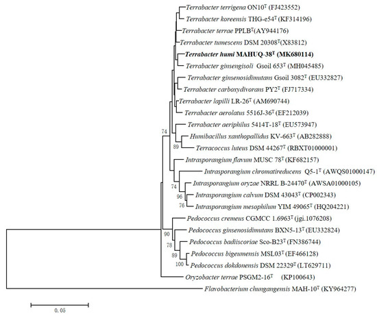 Neighbor-joining (NJ) tree based on 16S rRNA gene sequence analysis showing phylogenetic relationships of strain MAHUQ-38T and members of genus Terrabacter. Bootstrap values more than 70% based on 1000 replications are shown at branching points. Scale bar, 0.05 substitutions per nucleotide position.