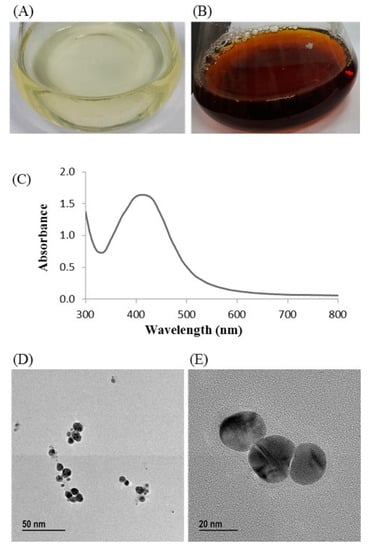 Reasoner’s 2A (R2A) broth with AgNO3 as a control (A); ecofriendly synthesized silver nanoparticles (AgNPs) (B); ultraviolet–visible (UV–vis) spectra (C); and field emission-transmission electron microscopy (FE-TEM) images of ecofriendly synthesized silver nanoparticles (D,E).