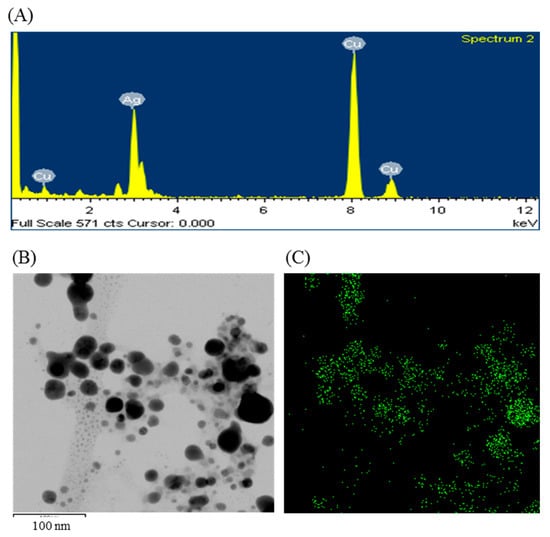Energy dispersive X-ray (EDX) spectrum of ecofriendly synthesized AgNPs (A); TEM image (electron micrograph region) used for mapping (B); and the distribution of silver in elemental mapping (C).