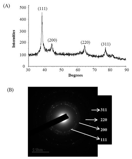 X-ray diffraction pattern (A) and selected area diffraction (SAED) pattern (B) of ecofriendly synthesized AgNPs.