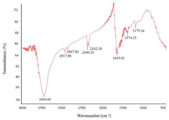 FT-IR (Fourier transform infrared) analysis was conducted to investigate the bio-active compounds, which may be responsible for the synthesis and stability of AgNPs as a capping agent. The FT-IR pattern showed different peaks throughout the entire range of analysis. FTIR analysis revealed visible bands at 3444.65, 2917.98, 2847.83, 2360.10, 2342.18, 1635.91, 1374.25 and 1175.36 cm−1 for biosynthesized silver nanoparticles (Figure 6). The band observed at 3444.65 cm−1 indicates O–H (alcohol) and/or N–H (amine) stretching. Bands observed at 2917.98 and 2847.83 cm−1 are attributed to C–H (alkane) stretching. The bands seen at 2360.10 and 2342.18 cm−1 represent O=C=O (carbonyl bond group). The band at 1635.91 cm−1 represents the N–H (amine) group. The bands observed at 1374.25 and 1175.36 cm−1 attributed to the C–H (alkane) and C–O (alcohol/ether) group, respectively. The FT-IR analysis revealed the presence of bio-active compounds, which may be responsible for the synthesis and stability of AgNPs. The present study was supported by the previous reports [23,24].