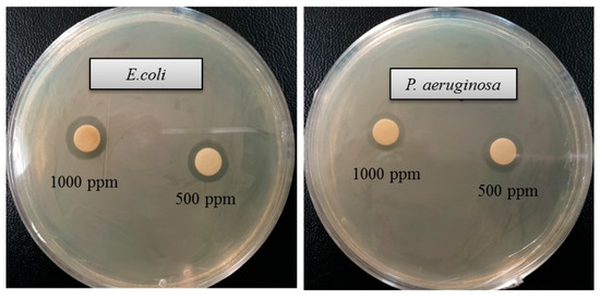 Zones of inhibition of ecofriendly synthesized AgNPs (30 μL) at 500 and 1000 ppm concentrations in water against E. coli and P. aeruginosa.
