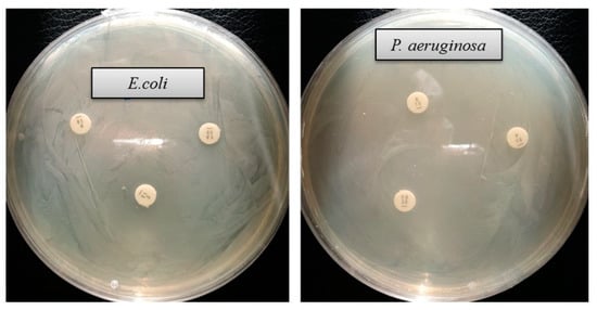 The emergence of multi-drug-resistant microorganisms is a serious concern for the medical sector, as it is difficult to control them by available antibiotics. So, it is essential to find out an alternative antimicrobial agent to control these multi-drug-resistant microorganisms. Ecofriendly synthesized AgNPs could be a potential candidate to control them. In the present study, AgNPs were synthesized using green technique and their antibacterial activity was investigated against drug-resistant pathogenic microorganisms, such as Pseudomonas aeruginosa and Escherichia coli. The results show that eco-friendly synthesized AgNPs have strong antibacterial efficacy against tested pathogens such as E. coli and P. aeruginosa (Figure 7). Figure 7 reveals the inhibition zones around the paper discs treated with AgNPs. The average results of the zone of inhibition are shown in Table 4. The antibacterial activity against pathogens was measured by calculating the diameter of the inhibition zone. The ecofriendly synthesized AgNPs showed highest antimicrobial activity against antibiotic-resistant E. coli followed by P. aeruginosa. The results suggest that Terrabacter humi MAHUQ-38T mediated AgNPs could be useful as an antimicrobial agent to control drug-resistant pathogens. The results of the present study were consistent with previously reported studies [22,25]. Both pathogens, P. aeruginosa and E. coli, were resistant to the three tested commercial antibiotics. The commercial antibiotics that were used in this study did not show any activity against tested pathogens (Figure 8, Table 5).