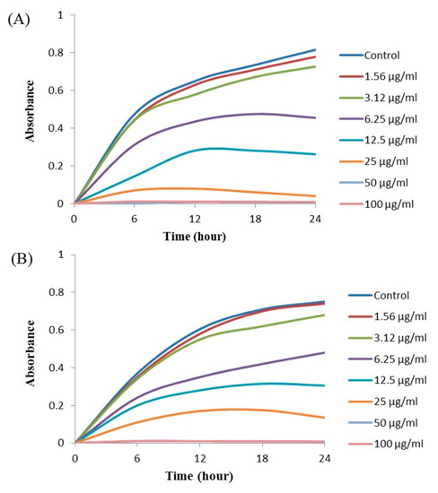 Growth curves of E. coli (A) and P. aeruginosa (B) cultured in Mueller–Hinton broth (MHB) with different concentrations of the synthesized AgNPs to determine the Minimal Inhibitory Concentration (MIC).