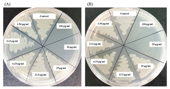 The MIC and MBC of AgNPs against E. coli and P. aeruginosa were determined by a standard broth microdilution method. From the results, it was noted that the green synthesized AgNPs showed an MIC of 6.25 μg/mL and 12.5 μg/mL for E. coli and P. aeruginosa, respectively, indicating that the synthesized AgNPs strongly suppressed the proliferation of these pathogens (Figure 9). The MIC of the AgNPs synthesized by strain MAHUQ-38T against E. coli were much lower than some other antimicrobial agents, including biosynthesized CuO-NPs and ZnO-NPs which were 0.5 mg/mL and 8 mg/mL, respectively, against E. coli [26,27]. The MICs of the AgNPs synthesized by strain MAHUQ-38T against P. aeruginosa were also significantly lower than some other antimicrobial agents, including biogenic nanoparticles, which were in the range 0.375–1.6 mg/mL against P. aeruginosa [28,29]. The MBCs of biosynthesized AgNPs for both E. coli and P. aeruginosa were 50 μg/mL (Figure 10), which was also much lower than those of some other antimicrobial agents [26,27,28].