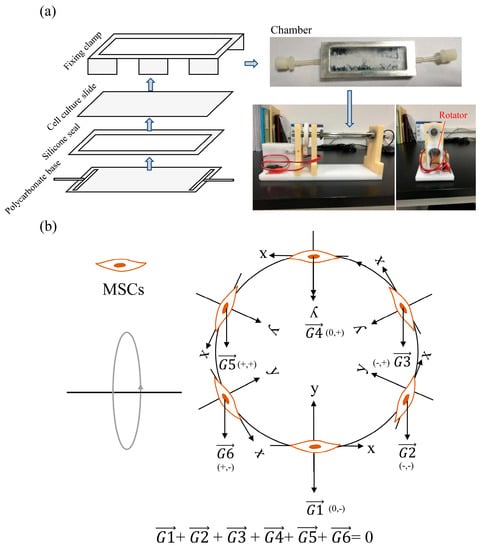 Simulated microgravity rotary flat chamber bioreactor. (a) Photograph of the clinostat used in this study to model simulated microgravity. (b) Schematic diagram explaining the gravity feeling of MSC on uniaxial clinostat used in this study. A system of rectangular coordinates based on the MSC is established. The gravity vector of MSCs changes constantly, following the rotating of the clinostat. The average gravity vector of MSCs is nulled after rotating one circle, as a result, the MSC could not feel the gravity.