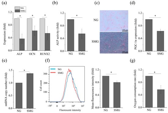 A two-dimensional clinostat device presented in the Figure 1 was used to stimulate microgravity in this study. We first assessed the effect of SMG on osteogenic differentiation of MSCs by testing the mRNA expression levels of osteogenic markers such as ALP, OCN, and RUNX2 by qRT-PCR. Figure 2a shows that the expression of the osteogenic-related markers obviously decreased under SMG conditions, compared to that of NG. ALP activity also obviously decreased under SMG conditions (Figure 2b). Additionally, a significant reduction for positive ALP staining of cells was observed under SMG conditions (Figure 2c). Next, we explored the effect of SMG on OXPHOS, as osteogenesis of MSCs was impaired. Although we observed an increasing level of mtDNA copy number (Figure 2e), we saw a significant decrease under the SMG conditions, in the expression of PGC-1α (Figure 2d), the mitochondrial mass (Figure 2f), and OCR (Figure 2g). Taken together, these results demonstrated that SMG hampered both osteogenesis and OXPHOS in MSCs.