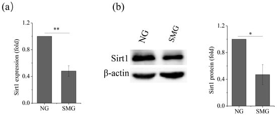 Studies showed that Sirt1 is a vital metabolic sensor and has a crucial role in osteogenic differentiation, we thus explored the effect of SMG on the expression of Sirt1. The results showed an evident downregulation of Sirt1 expression, both at the mRNA level (Figure 3a) and the protein level (Figure 3b), under the SMG conditions, as compared to that of NG, which indicated that the expression of Sirt1 was inhibited by SMG.