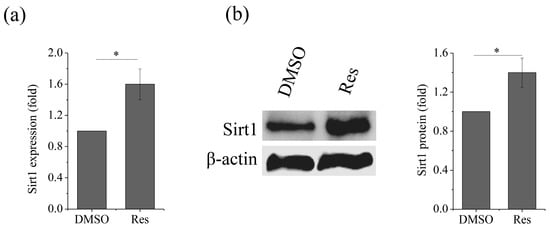 The expression of Sirt1 is upregulated after treatment with resveratrol. (a) Gene expression of Sirt1 after treatment with resveratrol. (b) Protein levels of Sirt1 after treatment with resveratrol. For each group, the values are the mean ± SEM from three representative independent experiments. Control—solvent control (DMSO). * p < 0.05. Res, resveratrol.