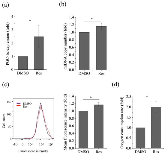 Upregulation of Sirt1 recovers OXPHOS of MSCs after exposure to SMG for 72 h with resveratrol treatment. (a) Gene expression of PGC-1α. The values are the mean ± SEM from four representative independent experiments. (b) Relative mtDNA copy number levels. The values are the mean ± SEM from four representative independent experiments. (c) Cells were stained with MitoTracker Green for mitochondrial mass and assessed by flow cytometry. The values are the mean ± SEM from three representative independent experiments. (d) Relative OCR levels. The values are the mean ± SEM from three representative independent experiments. Control—solvent control (DMSO). * p < 0.05. Res, resveratrol.