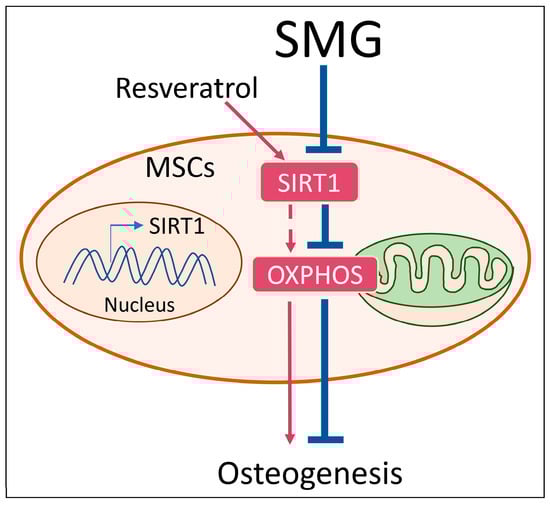 Proposed model by which SMG inhibits OXPHOS and thus hampers osteogenesis of MSCs. After exposure to SMG, Sirt1 was downregulated and OXPHOS was reduced, followed by the suppression of osteogenesis. Upon resveratrol treatment, Sirt1 was upregulated and OXPHOS was enhanced, and thus osteogenesis was recovered under SMG conditions. Collectively, SMG could induce a decrease in OXPHOS to inhibit osteogenesis of MSCs.