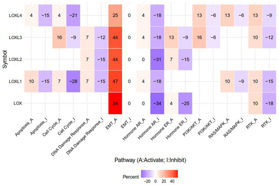 The epithelial–mesenchymal transition (EMT) pathway is activated by LOX, LOXL1, LOXL2, LOXL3, and LOXL4 in genomic big data-centric pathway analysis. Heatmap data demonstrated that LOX, LOXL1, LOXL2, LOXL3, and LOXL4 have activating/inhibiting (red/blue) functions on each cancer-related pathway. Note that LOX, LOXL1, LOXL2, LOXL3, and LOXL4 account for 54%, 47%, 44%, 44%, and 25% of cancers in the EMT-activating pathway, respectively. The pathway activity module was assessed with the GSCALite web server. High-throughput antibody-based technique reverse phase protein array (RPPA) was conduct to determine the expression of The Cancer Genome Atlas (TCGA) samples of at least 5 cancer types. Known cancer-related pathways are included: TSC/mTOR, RTK, RAS/MAPK, PI3K/AKT, hormone ER, hormone AR, EMT, DNA damage response, cell cycle, apoptosis.