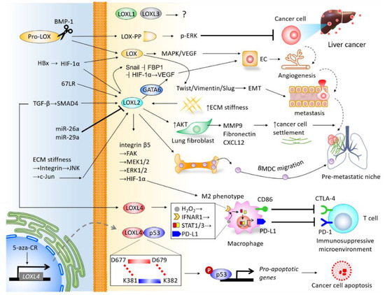 The formation of a tumor pre-metastatic niche in the distant organ, by which a fertile “soil” assists the settlement of circulating tumor cells, serves as a critical molecular event facilitating the subsequent implementation of distant metastasis [51]. In this regard, the role of LOXL2 in promoting the formation of local and distal metastatic niches has recently been noted. Wong et al. observed that HCC-derived LOXL2 promotes intrahepatic metastasis by increasing tissue stiffness to facilitate HCC cell motility and foster extrahepatic metastasis by enhancing recruitment of bone-marrow-derived cells to the pre-metastatic site in the lung [42]. The study further demonstrated a convergent control of HIF-1α, TGF-β/SMAD4 axis, microRNA-26a (miR-26a), and miR-29a upstream LOXL2 [42]. A study conducted by Wu et al. also supports the role of LOXL2 in assisting the formation of a pro-metastatic niche by facilitating BMDC motility [52]. Increased matrix stiffness upregulates LOXL2 expression by the integrin/JNK/c-JUN signaling pathway in HCC. The HCC-derived LOXL2 upregulates matrix metallopeptidase 9 (MMP-9) expression and fibronectin production in lung fibroblasts and functions as a chemoattractant to increase the invasion of BMDC and HCC [52].