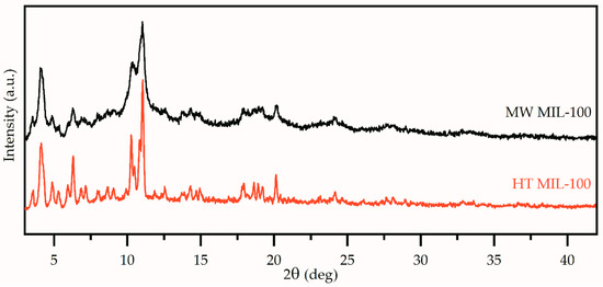 The PXRD patterns of the MIL-100 (Fe) synthesized by means of microwave-assisted and hydrothermal methods are illustrated in Figure 1. The peak positions and relative intensities of collected patterns were in agreement with the results reported for MIL-100 (Fe) [16]. The peak widths for the HT MIL-100 pattern were evidently smaller compared to those of MW MIL-100. This could be attributed to the larger sizes of the crystallites. Such results are quite expected as hydrothermal synthesis usually results in larger particles with improved crystallinity compared to the microwave-assisted method. The microwave method usually requires less time, however, and results in smaller particles with weaker crystallinity.
