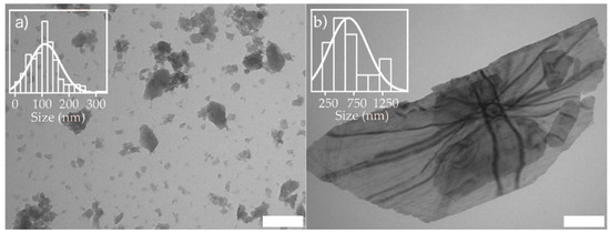However, the analysis of size distribution of HT MIL-100 particles did not show unimodal distribution. There was a fraction of smaller particles with a mean size of about 500 nm. Large micrometer particles were also observed for HT MIL-100. Interestingly, transparent TEM images of HT MIL-100 particles (Figure 2b) suggest the nanosheet structure of the particles. Moreover, Kikuchi lines were clearly visible on TEM images of the large crystal, suggesting bending of the nanosheet. This bending may occur due to the presence of smaller particles, which were also visible under the largest one. The reason for the deviation of particle sizes from a normal distribution for the HT MIL-100 sample could be the crumpling of the nanosheets of MIL-100.