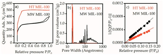 The isotherm for MW MIL-100 is of type IV, according to the IUPAC classification (Figure 3a). The isothermal region under the relative pressures 0–0.2 corresponded to the formation of a monolayer and indicated the presence of micropores. However, a pronounced hysteresis loop caused by the effect of capillary condensation indicated the presence of mesopores. These data are in good agreement with the pore size distribution on Figure 3b. Along with micropores in the 2 nm region, MW MIL-100 had intense peaks corresponding to the pores larger than 10 nm. The specific surface areas for both samples were calculated by the Brunauer–Emmett–Teller (BET) method in the range of relative pressures of 0.03–0.15 at 25 points (Figure 3c). The correlation coefficient was not less than 0.9996, which shows good correspondence of the selected range to the linear form of the BET equation. The specific surface areas were 1929 m2/g for the HT MIL-100 and 1075 m2/g for the MW MIL-100. The available pore volumes calculated at the point P/P0 = 0.97 were 0.77 for HT MIL-100 and 0.60 for MW MIL-100. A typical specific surface area of bulk MIL-100 (Fe) is usually about 2800 m2/g [16]. Such reduction in the surface area could be the result of aggregation of MW MIL-100 nanoparticles and crumpling of HT MIL-100 nanosheets observed on TEM images.