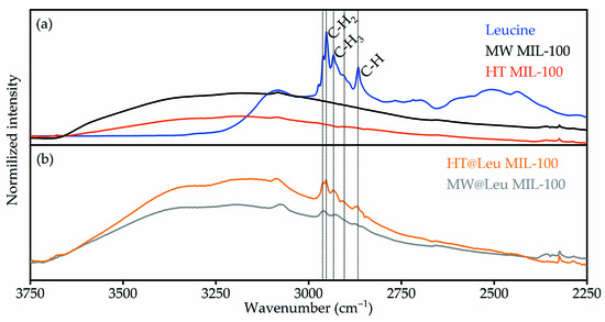 Figure 5a shows the FTIR spectra of pure MW MIL-100 and HT MIL-100 samples compared to those of leucine. It can be estimated that the intensity of the water peak in samples loaded with ᶫ-leucine was significantly lower (Figure 5b) than that in pure samples. This suggests that the presence of ᶫ-leucine in the pores of a metal-organic framework structure displaces a certain number of water molecules. The presence of ᶫ-leucine confirms an increase in the intensity of the peaks corresponding to vibrations of the C-H (2867 cm−1), C-H3 (2904 and 2934 cm−1), and C-H2 (2952 and 2961 cm−1) groups of ᶫ-leucine.