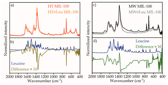 Figure 6c shows FTIR spectra of pure MW MIL-100 and MW@Leu MIL-100 loaded with ᶫ-leucine. Figure 6d shows their difference spectrum compared to the spectrum of pure leucine. Similar changes were observed when ᶫ-leucine was loaded with the HT MIL-100 sample, but to a much lesser extent. Thus, it can be concluded that absorption of ᶫ-leucine was less efficient.