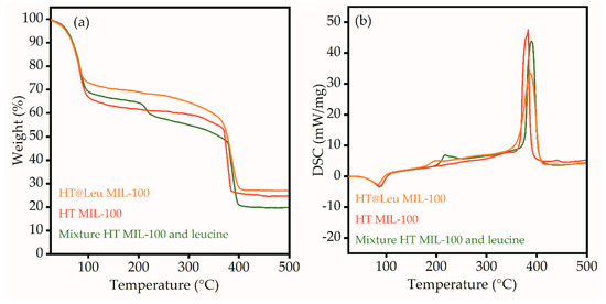 Figure 7 shows the thermogravimetric analysis and differential scanning calorimetry (TGA-DSC) of the HT MIL-100, HT@Leu MIL-100, and mixture of pure leucine and HT MIL-100. All samples lost weight at 75 °C (Figure 7a). This is attributed to the evaporation of water molecules from the surface and pores of the particles, and additionally confirmed by the endothermicity of the process (Figure 7b). Paying attention to the TGA curve of the mechanical mixture of leucine and HT MIL-100 in Figure 7a, one can see the weight loss at a temperature of 218 °C and the corresponding exothermic process on the DSC profile (Figure 7b). This temperature corresponds to the degradation temperature of leucine. A similar process can be seen on the DSC profile of the HT@Leu MIL-100. However, the peak of exothermic process shifted to the lower temperatures. The weight loss on the TGA curve was also much lower. This aspect can be explained by the process of destruction of ᶫ-leucine in the pores of the MIL-100; however, the change in mass was small and, therefore, not reflected in the TGA curve. The last endothermic process was associated with the decomposition of the MIL-100 framework. The difference in the intensity of this peak on the DSC profile is explained by the different weight loading of the samples.