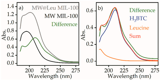 UV-VIS spectra measured for the diluted supernatant of MW@Leu MIL-100 (grey) and MW MIL-100 (black) samples and their difference spectrum (green) (a). Difference spectra (green), leucine (orange), H3BTC (blue), and a sum of leucine and H3BTC components (red) (b).