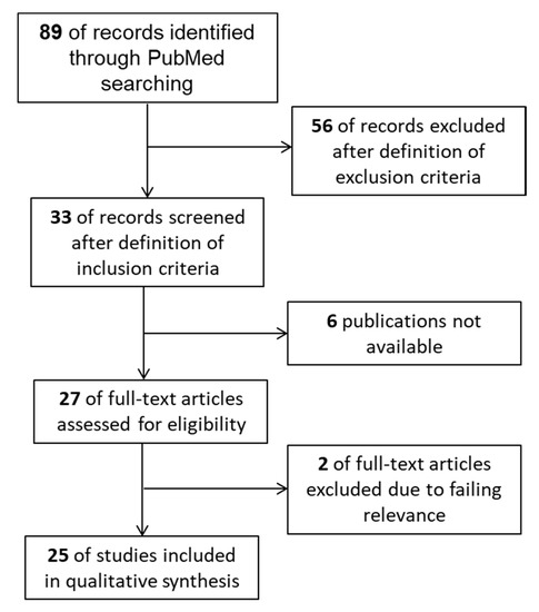 The PRISMA Statement was utilized as a reporting item [53] and a literature search of MEDLINE (PubMed) was carried out using a defined strategy (Section 4: Material and Methods). A search of the latest literature comprising the time period 1988–2020 resulted in 89 publications. After the application of distinct inclusion criteria, 56 of the records were excluded. Then, 33 of the records were screened for further relevance. Six papers out of 33 were not available. For the remaining 27 items, full-text articles were assessed. Two further full-text articles were excluded due to lacking relevance to NK cells and NKT cells and/or periodontitis. Finally, 25 of the studies were identified for qualitative analysis (Figure 1).