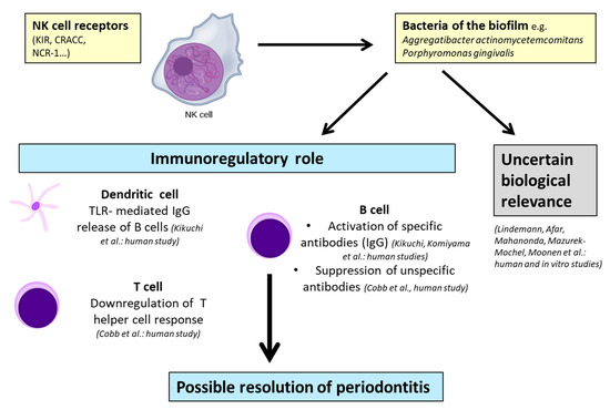 In addition to the proinflammatory functions, Komiyama et al. [54] and Kikuchi et al. [63] also demonstrated the protective properties of NK cells through reduced B-cell activity [54] or the production of immunoglobulin G2 (IgG2) in gingival crevicular fluid [63]. Kikuchi et al. [64] described a different role of interferon gamma as, in their opinion, interferon gamma produced by NK cells is necessary for specific IgG2 production. This process, which is induced by Porphyromonas gingivalis, is connected to DC–NK interactions and results in the reciprocal activation of dendritic cells and NK cells. Cobb et al. [56] examined human biopsies in their study and concluded that NK cells may have immunoregulatory functions in periodontitis through the regulation of T-cell proliferation and suppression of B-cell immunoglobulin production.