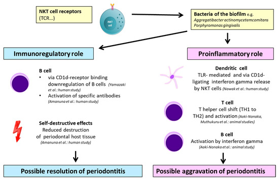 Performing human biopsies and immunostaining [74] in combination with an analysis of lymphocytes from peripheral blood and gene analysis [73], Yamazaki et al. and Amanuma et al. concluded that NKT cells infiltrating periodontal lesions seem to have a downregulating role in autoimmune responses via activation by CD1d-expressing B cells. This could lead to the production of antibodies in autoimmune reactions in periodontitis [74].