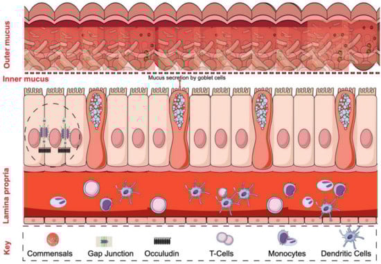 The gastrointestinal (GI) tract’s epithelium represents the largest mucosal lining that provides an interface between mammalian host and the external environment. The lumen of the gut harboring trillions of microbial inhabitants plays a vital role digestion and influences the immune system. The outstanding anatomical architecture of the GI fine-tunes processes like absorption and digestion of food, neuroendocrine networking, and immunological balance [1]. Despite being in continuous interaction with various foodborne pathogens and antigens, the GI lining very efficiently checks invasion by microorganisms and other molecules through its paracellular space, thereby maintaining its capability of intestinal permeability. The paracellular space size ranges approximately from 10 to 15 Å, implying that, under physiological situations, solutes with a molecular radius above 15 Å (~3.5 kDa) have to be barred from the uptake path [2]. The transfer of macromolecules is controlled principally by epithelia’s paracellular permeability, whose regulation is dependent on the attuned intercellular tight junctions [3]. A fast-rising number of illnesses, including autoimmune diseases, are reported due to intestinal permeability changes relative to changes in tight junctions (TJs) [4]. The change in permeability of the GI tract’s epithelial lining creates an easy passage for commensal bacteria and their products from the lumen into the bloodstream (referred to as the leaky gut), thereby evoking immune response. Studies have well documented autoimmune diseases that arise due to the underlying phenomenal problem of the leaky gut [5,6].